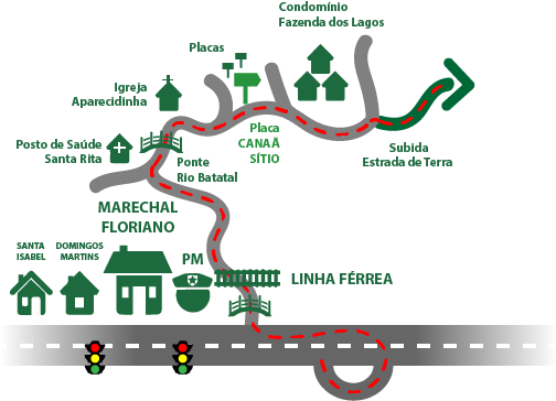 - Seguir em frente passando pela linha férrea, pelo Posto de Saúde Santa Rita, pela Igreja Aparecidinha e pelo Condomínio Fazenda dos Lagos.