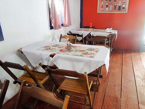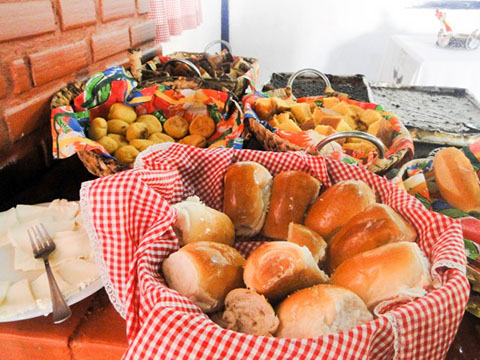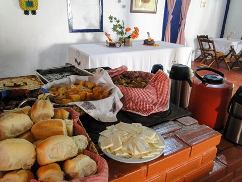 Nosso café da manhã é diferenciado com variedades de bolos caseiros, tortas salgadas, queijo minas produzido na região, banana, batata doce, pão doce e pão francês assados na hora especialmente para o café da manhã acompanhados de chocolate quente e frio, suco e café preto.